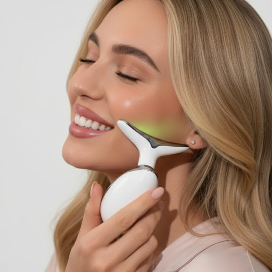 Bei der Recherche bin ich auf LiftGlow von Luganos gestoßen – ein Heimpflege-Tool, das EMS-Mikrostimulation mit LED-Licht kombiniert. Die Idee: Muskeln sanft aktivieren (für straffere Konturen) und gleichzeitig die Haut beruhigen und pflegen. Keine invasive Behandlung, keine stundenlangen Termine – nur 5 Minuten täglich.